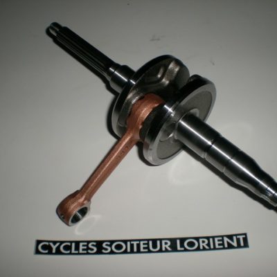 Il est fabriqué en masse pleine rectifiée avec un bouchon d’équilibrage en aluminium anodisé (ce qui réduit les volumes morts dans le bas moteur tout en garantissant un équilibrage maximum et une bonne inertie). Il bénéficie d’une bielle forgée et rectifiée avec traitement thermique et d’une cage à aiguilles (tête de bielle) INA racing démontable qui peut supporter jusqu’à 18 000 tours/min. Le maneton présente un diamètre de 18 mm contre un diamètre de 16 mm pour l’origine.